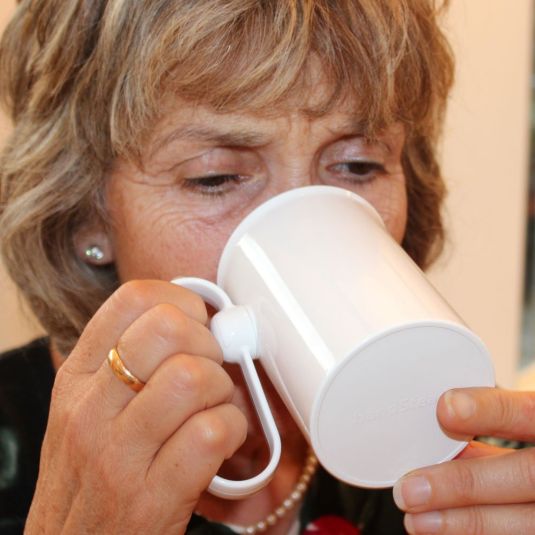 Ideal for anyone with limited dexterity or who experiences hand pain, swallowing difficulties, tremors or weakness, the Handsteady Mug is a unique drinking aid that can help to make drinking much easier.